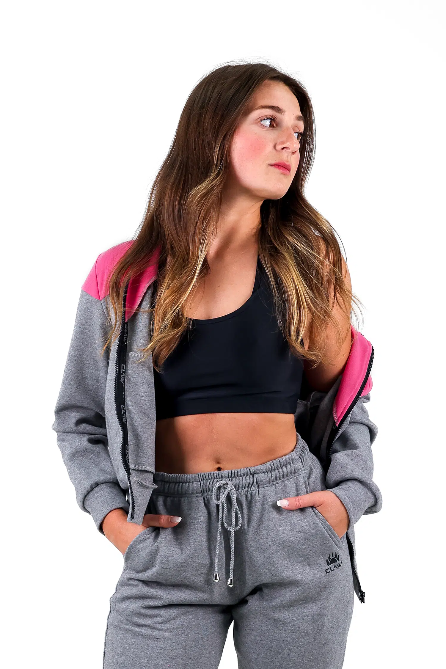 Casaco em jersey cinzento com apontamentos em rosa, uma peça essencial no teu guarda-roupa, que podes coordenar com calças ou calções para um look total.